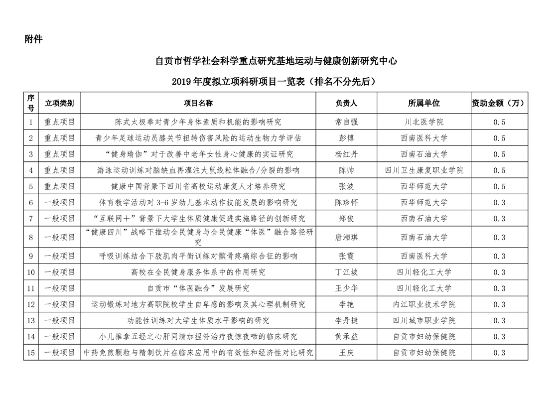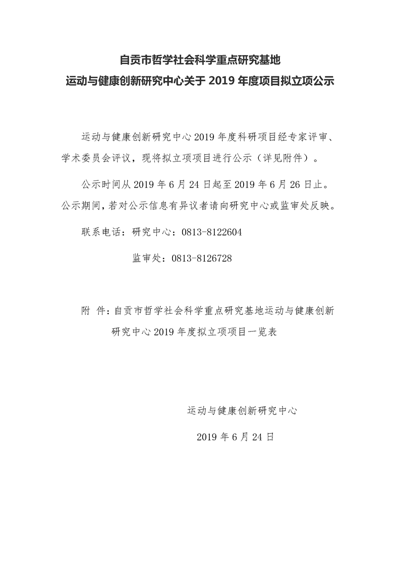 自贡市哲学社会科学重点研究基地运动与健康创新研究中心关于2019年度科研项目拟立项公示