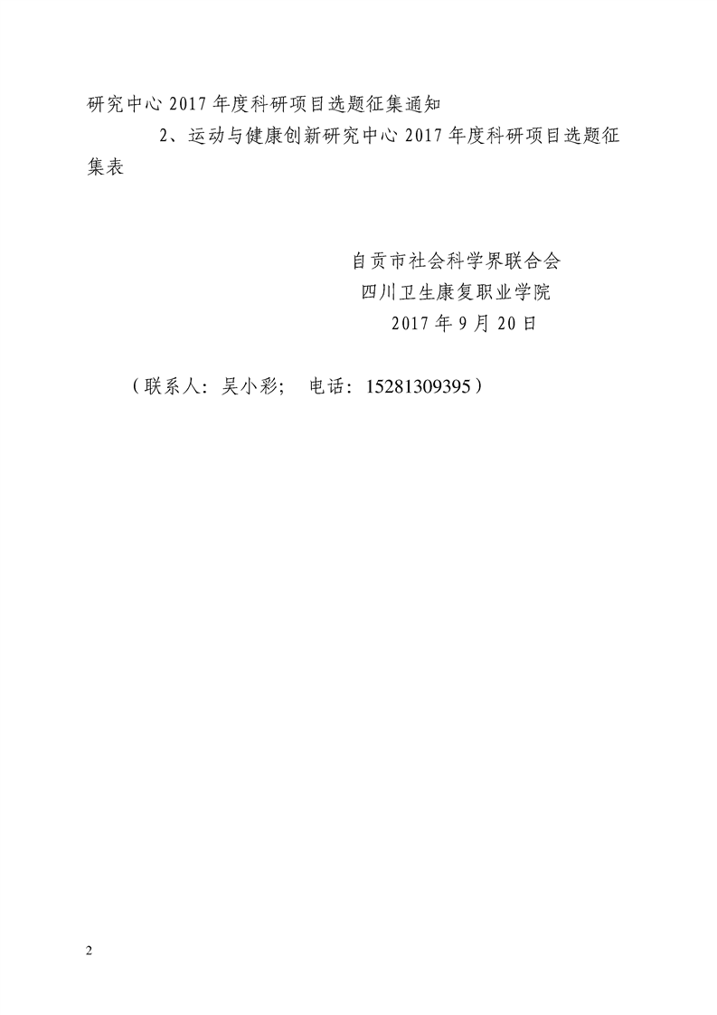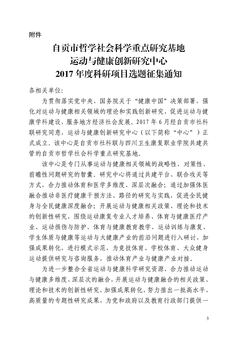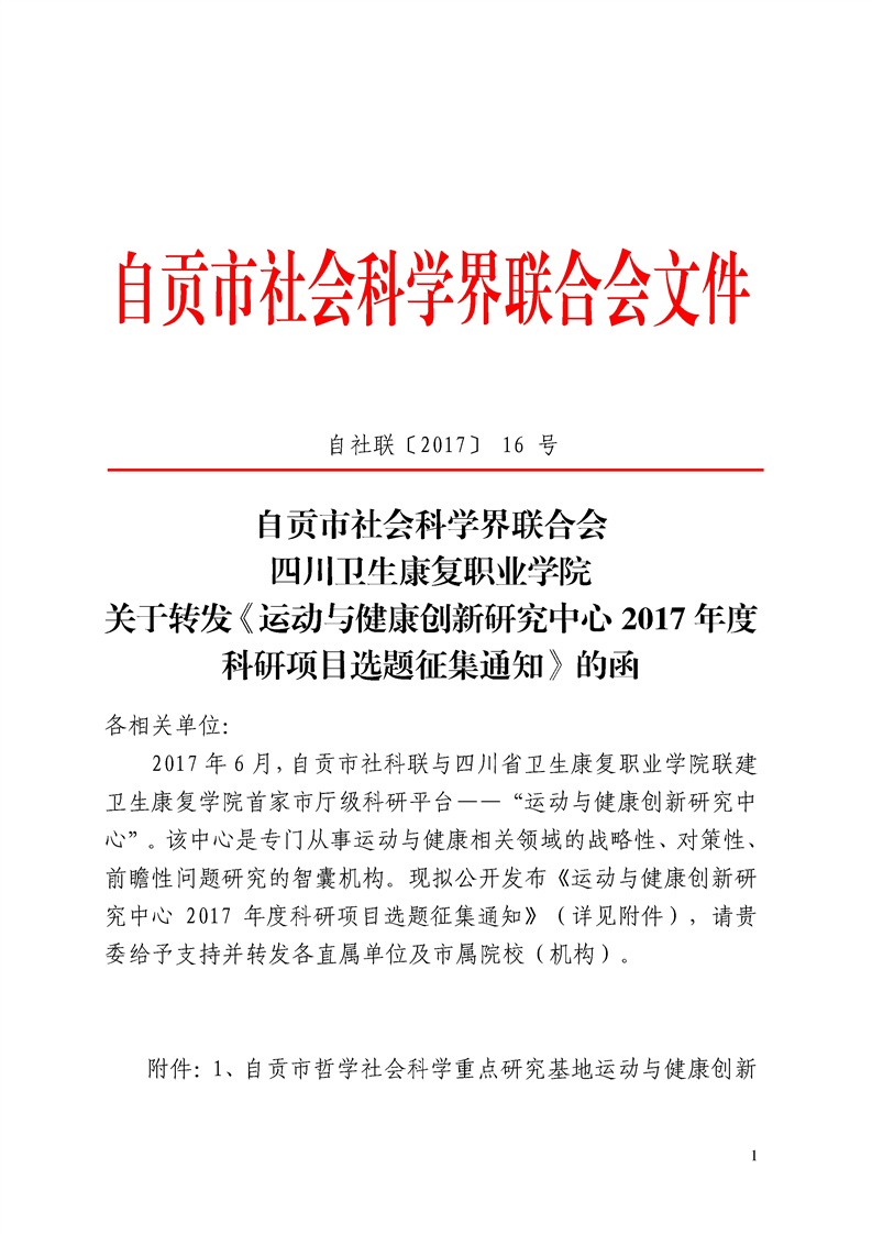 自贡市社会科学界联合会、bat365官方网站关于转发《运动与健康创新研究中心2017年度科研项目选题征集通知》的函