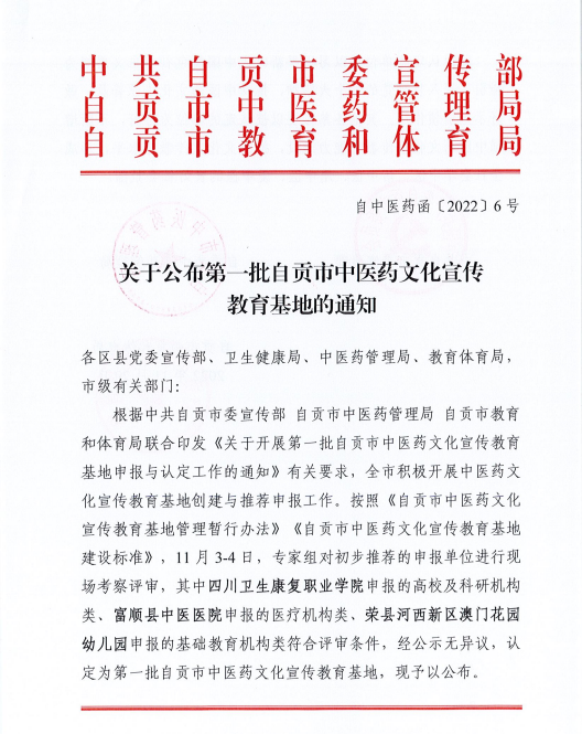 接《关于公布第一批自贡市中医药文化宣传教育基地的通知》,bat365药品食品学院申报的中医药文化宣传教育基地,经过专家现场考察评审,符合《自贡市中医药文化宣传教育基地管理暂行办法》《自贡市中医药文化宣传教育基地建设标准》评审条件,被中共自贡市委宣传部、自贡市中医药管理局、自贡市教育体育局联合认定为第一批“自贡市中医药文化宣传教育基地”。特此报喜。
