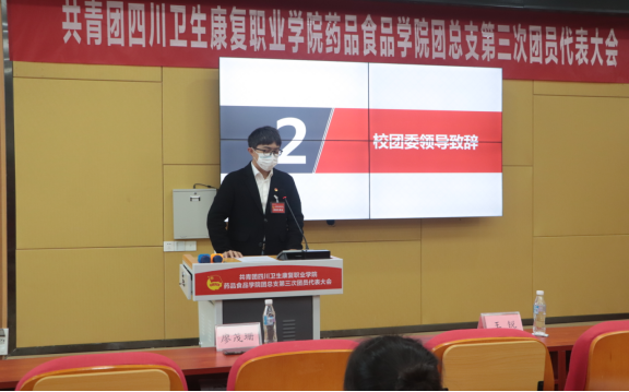 校团委副书记王锐同志致辞讲话,团员代表大会是学校共青团的一件政治大事,是学习和贯彻党的“二十大”精神的具体体现,希望全体代表珍惜光荣职责和使命,勠力同心为共青团事业高质量发展献计出力。