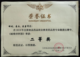 近年来,药品食品学院教师先后获得各种奖项32项(国家级12项),主要包括:“全国十佳青年临床药师”1项、“天府万人计划”1项,“凤凰创壹杯”全国职业院校信息化教学大赛三等奖,全国中等职业学校医药卫生类专业“创新杯”教师信息化教学设计和说课大赛一等奖,全国食品药品职业教育药学类专业云课堂比赛三等奖,四川省中医药教育协会高职组说课比赛一等奖,自贡市人民政府教学成果奖二等奖,全国食品药品职业教育微课比赛二等奖1项、三等奖2项,全国临床创新与发明大赛三等奖3项,四川省职业院校教师教学能力大赛二、三等奖各1项,四川省中医药职业教育协会教学设计比赛三等奖1项,“黄炎培职业教育杰出教师奖”1项,“四川省卫生健康系统先进个人”1项,首届全国教材建设先进个人四川省推荐提名1项,“盐都万人计划优秀科技人才”1项,成渝双城经济圈医药卫生职教联盟首届论文征集评比一等奖2项、二等奖1项等。