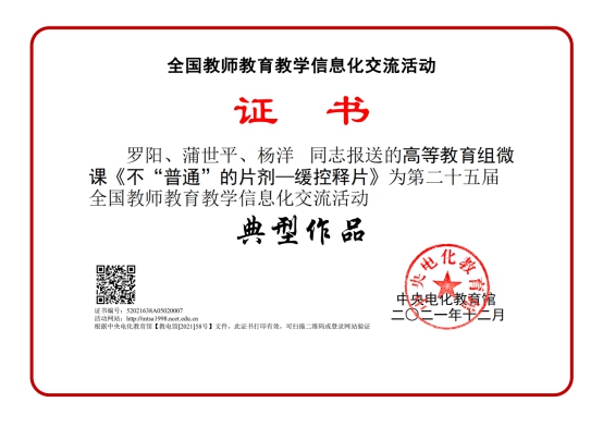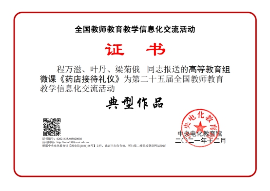 近日,由中央电化教育馆主办的2021年度全国教育教学信息化交流展示活动-第二十五届全国教师教育教学信息化交流活动圆满结束,药品食品学院教师罗阳、蒲世平、杨洋微课作品《不“普通”的片剂—缓控释片》与程万滋、叶丹、梁菊俄微课作品《药店接待礼仪》被评为全国教师教育教学信息化交流活动典型作品,邹利、李杰、李勇老师的微课作品《点丁成珠-蛤粉炒阿胶炮制技术》被评为全国教师教育教学信息化交流活动研讨作品。