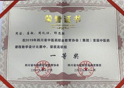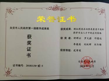 近年来,药学系教师先后获得各种奖项28项(国家级12项),其中获得2013、2015年自贡市说课比赛二等奖、一等奖,2014年“凤凰创壹杯”全国职业院校信息化教学大赛三等奖,2015年全国中等职业学校医药卫生类专业“创新杯”教师信息化教学设计和说课大赛一等奖,2017年全国食品药品职业教育药学类专业云课堂比赛三等奖,2018年四川省中医药教育协会高职组说课比赛一等奖,2018年自贡市人民政府教学成果奖二等奖等,2019年获全国食品药品职业教育微课比赛二等奖1项、三等奖2项,全国临床创新与发明大赛三等奖1项。