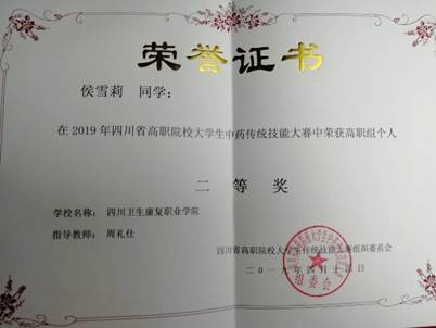 药学系学生2019年荣获全国“数字营销—新零售”技能大赛二等奖1项,荣获四川省高职院校大学生中药传统技能大赛二等奖1项、三等奖2项,荣获四川省学生创新创业大赛铜奖2项。