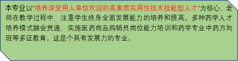 本专业培养德、智、体、美全面发展,践行社会主义核心价值观,具有良好职业道德和人文素养,具有一定发展潜力和创新能力,掌握必需的化学和医学基础理论、药物制剂生产及药品检验、药品营销和经营管理、合理用药指导等相关知识,具备药品调剂、选药用药指导以及药品生产、检验、销售等专业技能,面向药品生产企业、药品经营企业(医药公司、社会药房)、医疗机构、药政管理部门(含药检所)等单位或部门工作岗位的高素质技术技能型人才。