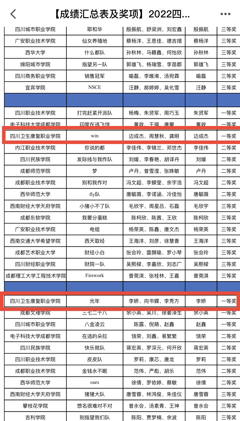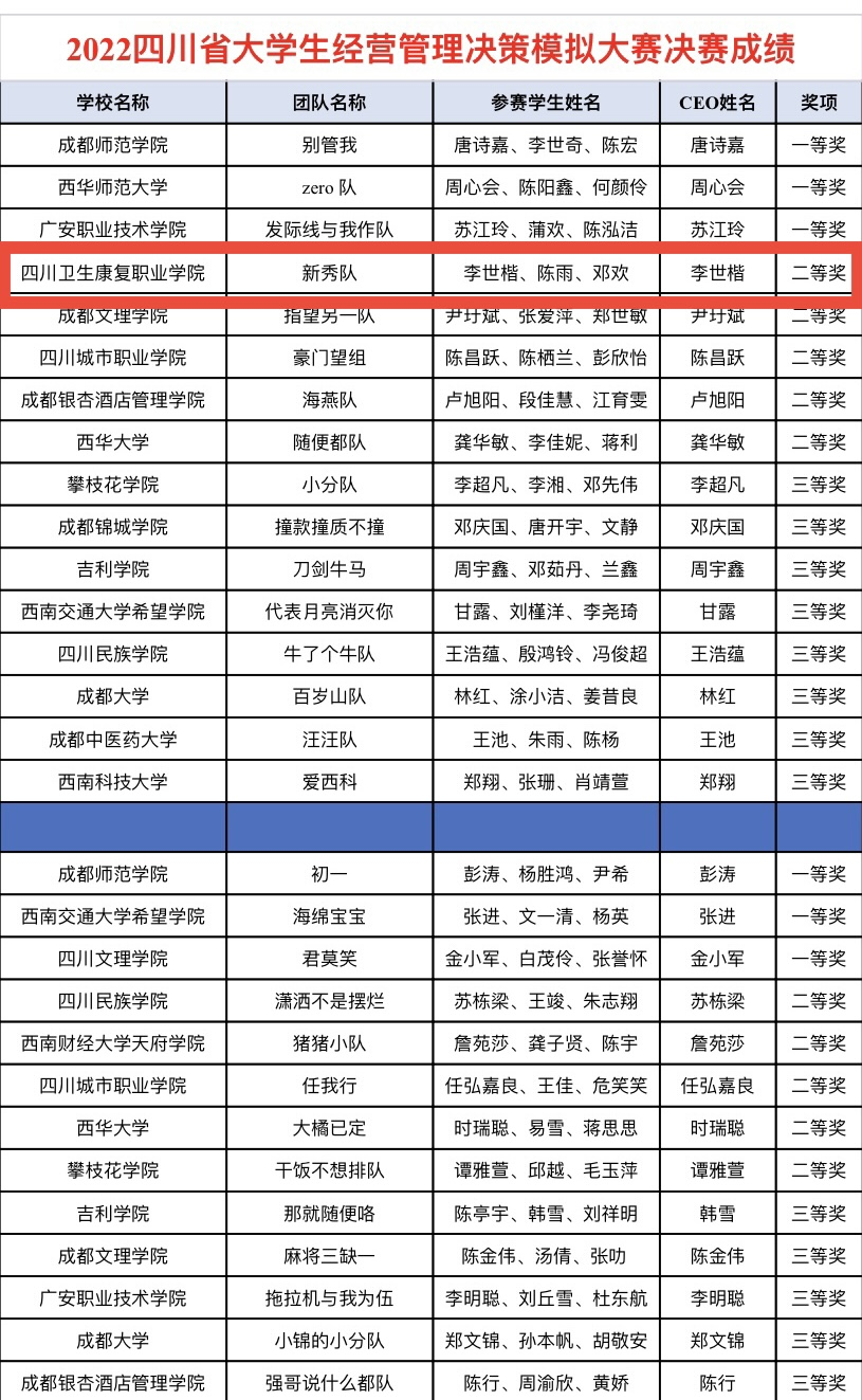 11月5日,在四川省教育厅主办的2022年四川省大学生经营管理决策模拟大赛中,bat365药品食品学院学生3支队伍进入决赛,与本科、高职高专学生同台竞技,最终斩获一等奖2项,二等奖1项。本次比赛共有全省39所高校128支队伍参赛。特此报喜。