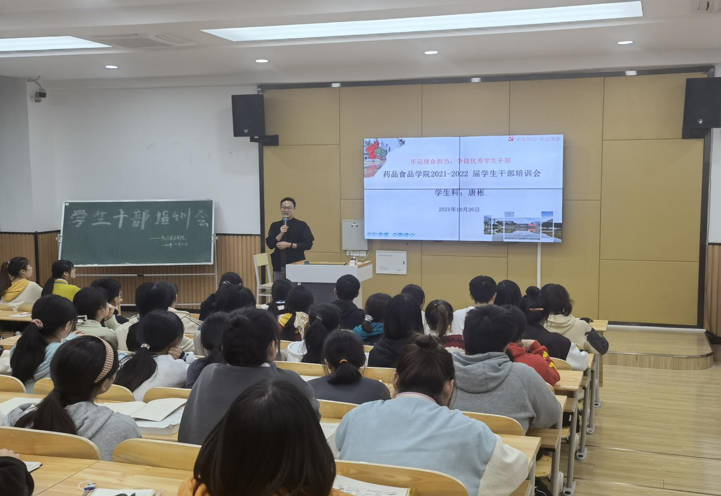 为进一步加强学生干部队伍建设,10月26日,药品食品学院在1-B301举行了2021-2022届学生干部系列培训首训。本次培训分为五个专题,包括基本素质提升、情绪管理与心理调适等内容,重点提升学生干部的党性修养、理论素养,切实提高基层团组织工作、学生活动组织、应急处置等工作能力,着力塑造出一支成绩优、作风好、能够打硬仗的学生干部队伍,切实发挥学生干部在“自我管理、自我教育、自我服务”中的作用,促进学生成长成才。首场培训会由药品食品学院副院长杨光丽和学生科科长唐彬主讲,130余名学生干部到场参训。