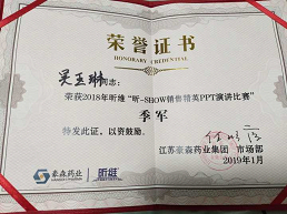 bat365首届“豪森医药班”、16级药学1班学生吴玉琳,在江苏豪森药业集团有限公司举办的“昕show销售精英演讲比赛”――四川区域赛中荣获一等奖,在集团总部决赛中荣获“季军”。