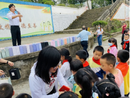 四、发放活动纪念品及合影留念。活动最后,药品食品学院院长钟辉云、副院长杨光丽等为小朋友们分发活动纪念品,并合影留念。