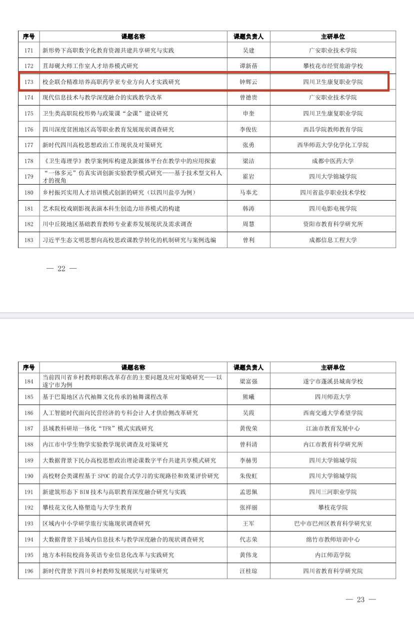 10月17日,接《四川省教育厅关于下达 2019 年度教育科研课题的通知》(川教函〔2019〕514 号),药学系主任钟辉云主持的科研课题《校企联合精准培养高职药学亚专业方向人才实践研究》成功立项。