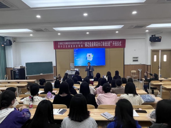 开班仪式上,优秀校友、健之佳自贡地区经理易小娟就自己在健之佳的成长、学习、晋升经历做了分享。同时也鼓励订单班学员们努力学好专业知识,为即将迎来的实习工作打好基础。