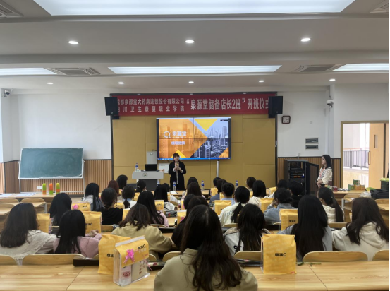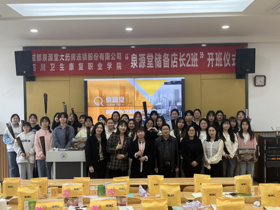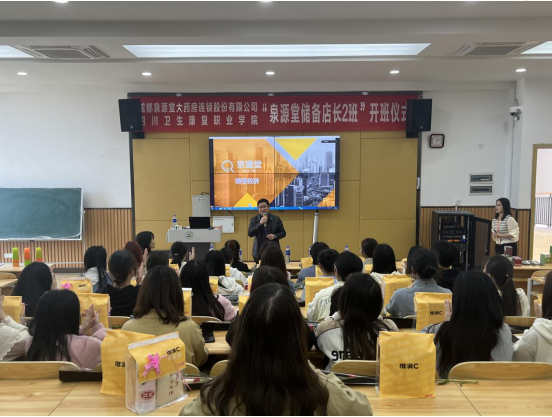 3月8日下午,“泉源堂储备店长2班”开班仪式在1教B305举行泉源堂大药房连锁股份有限公司运营总监万芩岑,HRBP经理牟芳,HRBP副总监袁维,药品食品学院院长钟辉云,药品食品学院教师,2023届订单班学生参加开班仪式。
