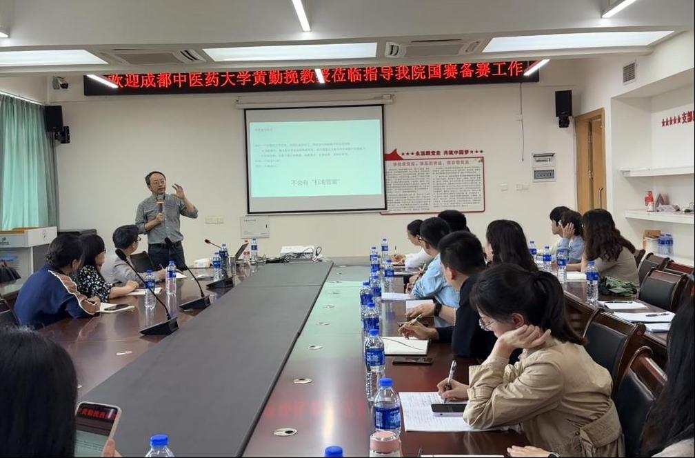 4月10日,药品食品学院以“党建引领促备赛,匠心铸魂强技能”为主题,特邀世界职业院校技能大赛国际赛、争夺赛、排位赛、冠军总决赛裁判员——成都中医药大学中药炮制制剂系主任黄勤挽教授开展国赛专题培训。学院党总支副书记/院长钟辉云、教师党支部书记/副院长杨光丽及学院近30名教师参加,临床医技学院、护理学院派出备赛团队参与,通过“党建+赛训”深度融合,吹响备战国赛冲锋号。