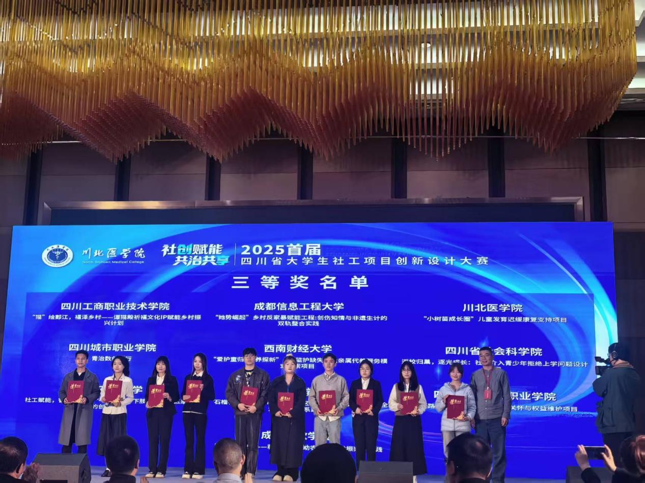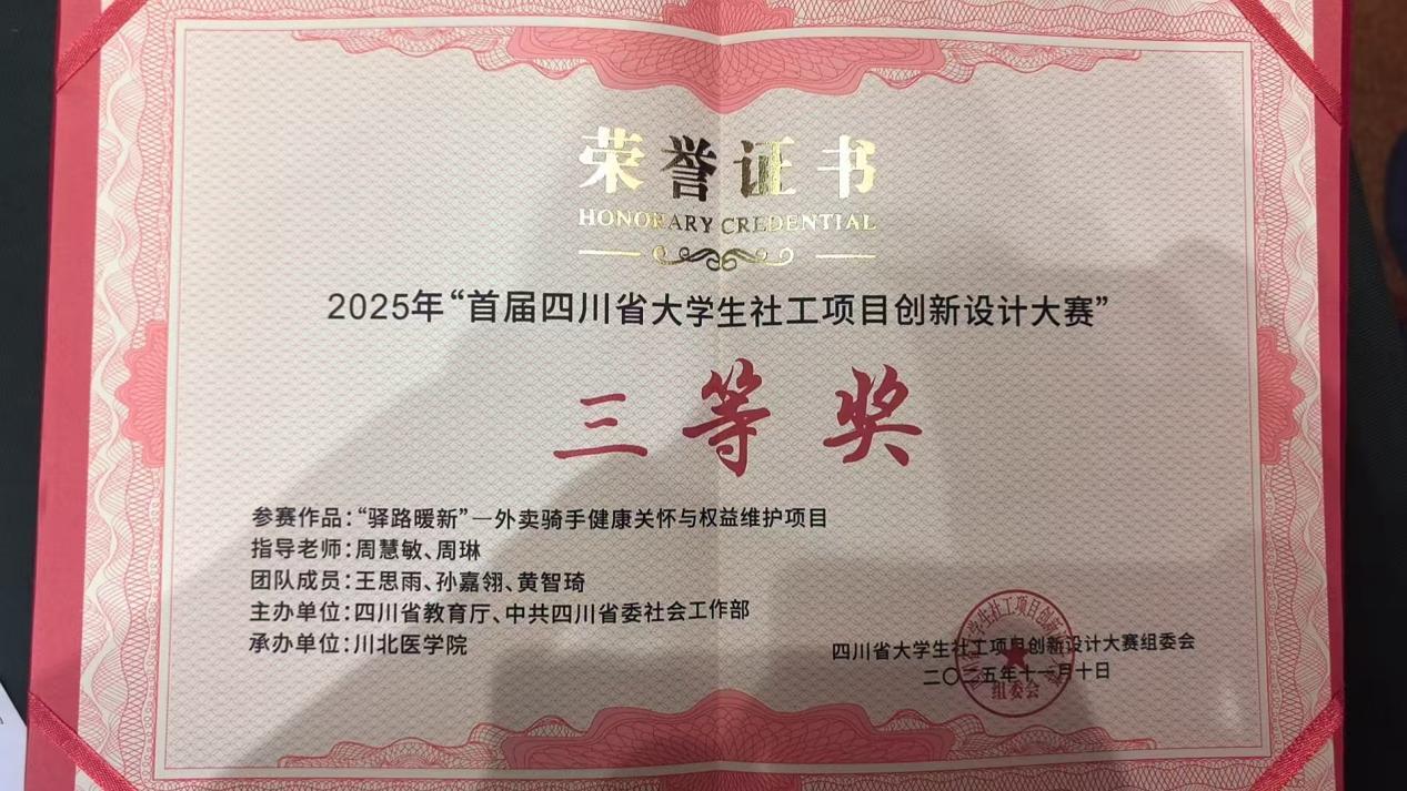 11月10日,bat365在四川省教育厅、中共四川省委社会工作部主办、川北医学院承办的2025年首届四川省大学生社工项目创新设计大赛中,由周慧敏老师、行业指导周琳老师指导的项目《驿路暖新—外卖骑手健康关怀与权益维护项目》获得三等奖。