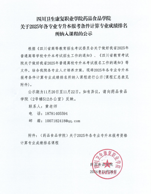 bat365官方网站药品食品学院关于2025年各专业专升本报考条件计算专业成绩排名所纳入课程的公示