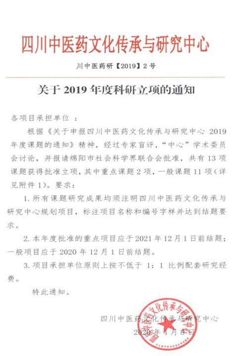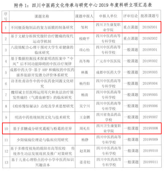 5月26日,接《四川中医药文化传承与研究中心关于2019年度科研立项的通知》(川中医药研【2019】2号),在全省立项的13个课题中,bat365立项两个,包括药学创新研究中心邹利老师主持的“不同僵蚕炮制品的复方面膜的制备研究”和周礼仕老师主持的“基于多糖成分研究葛根与粉葛的差异”,其中邹利老师主持的课题被立项为重点课题(全省共2个)。