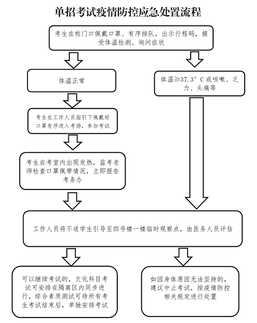 2.考生进校,须佩戴口罩,出示身份证、准考证、健康码,测量体温,体温正常进入校园,体温异常学生到校门口临时观测点观察。
