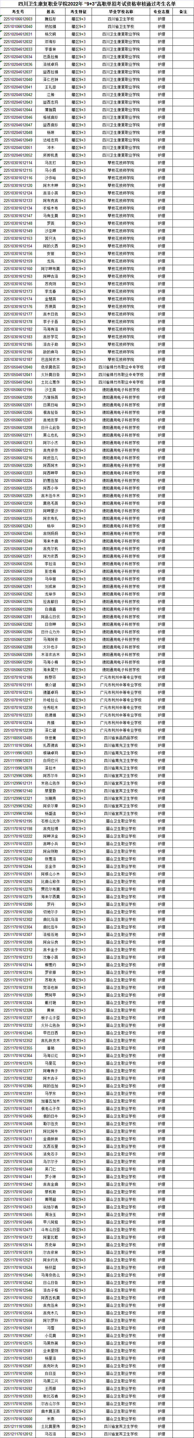 根据《四川省高等教育招生考试委员会 四川省教育厅关于印发四川省2022年高等职业学校面向涉藏州县和大小凉山彝区县“9+3”毕业生单独招生工作实施方案的通知》(川教涵【2022】 113号)文件精神以及《bat365官方网站2022年“9+3”高职单招招生章程》规定,经省考试院审核,现将具有参加bat3652022年 “9+3”高职单招考试资格的考生名单的通知如下(见附件1)。请名单内的考生于2022年4月24-25日登陆学院2022年“9+3”单独招生报名系统(http://gzdz93-5194.gaokao345.com/)打印准考证,并按要求准时到校参加考试。