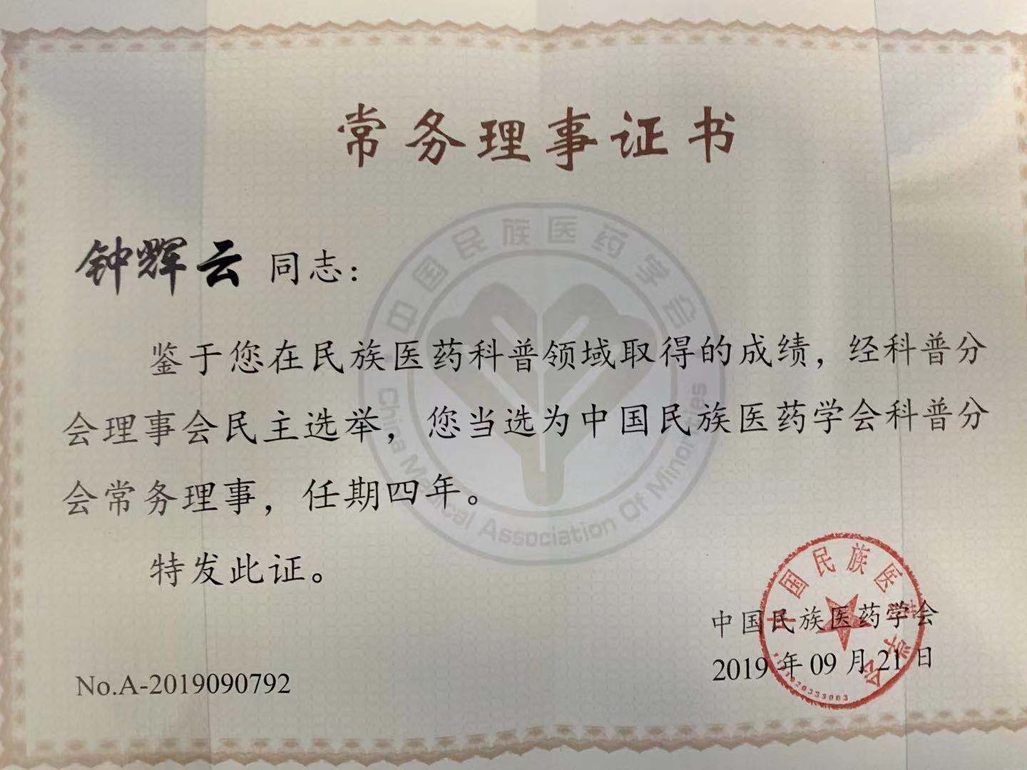 中医药文化科普实践基地负责人钟辉云当选中国民族医药学会科普分会常务理事